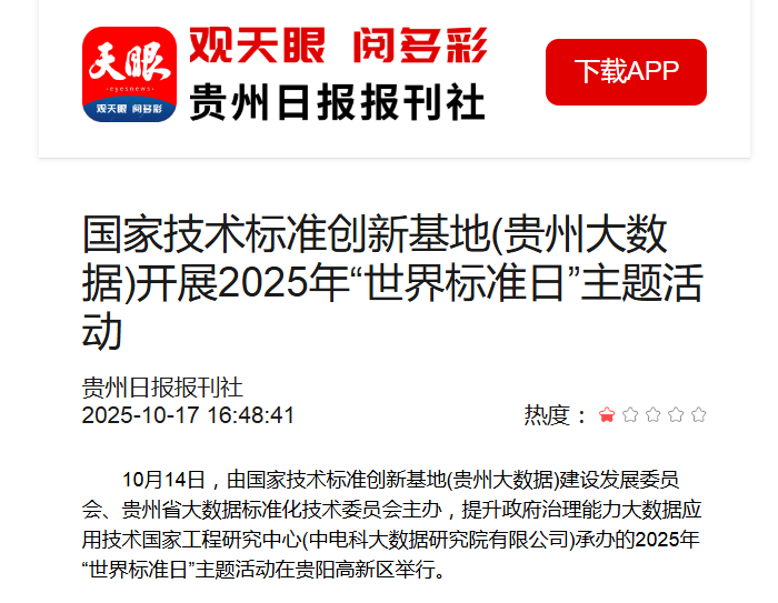 編者按:近日,貴州日報天眼新聞報道國家技術標準創新基地(貴州大數據)開展2025年“世界標準日”主題活動情況,詳情如下:
